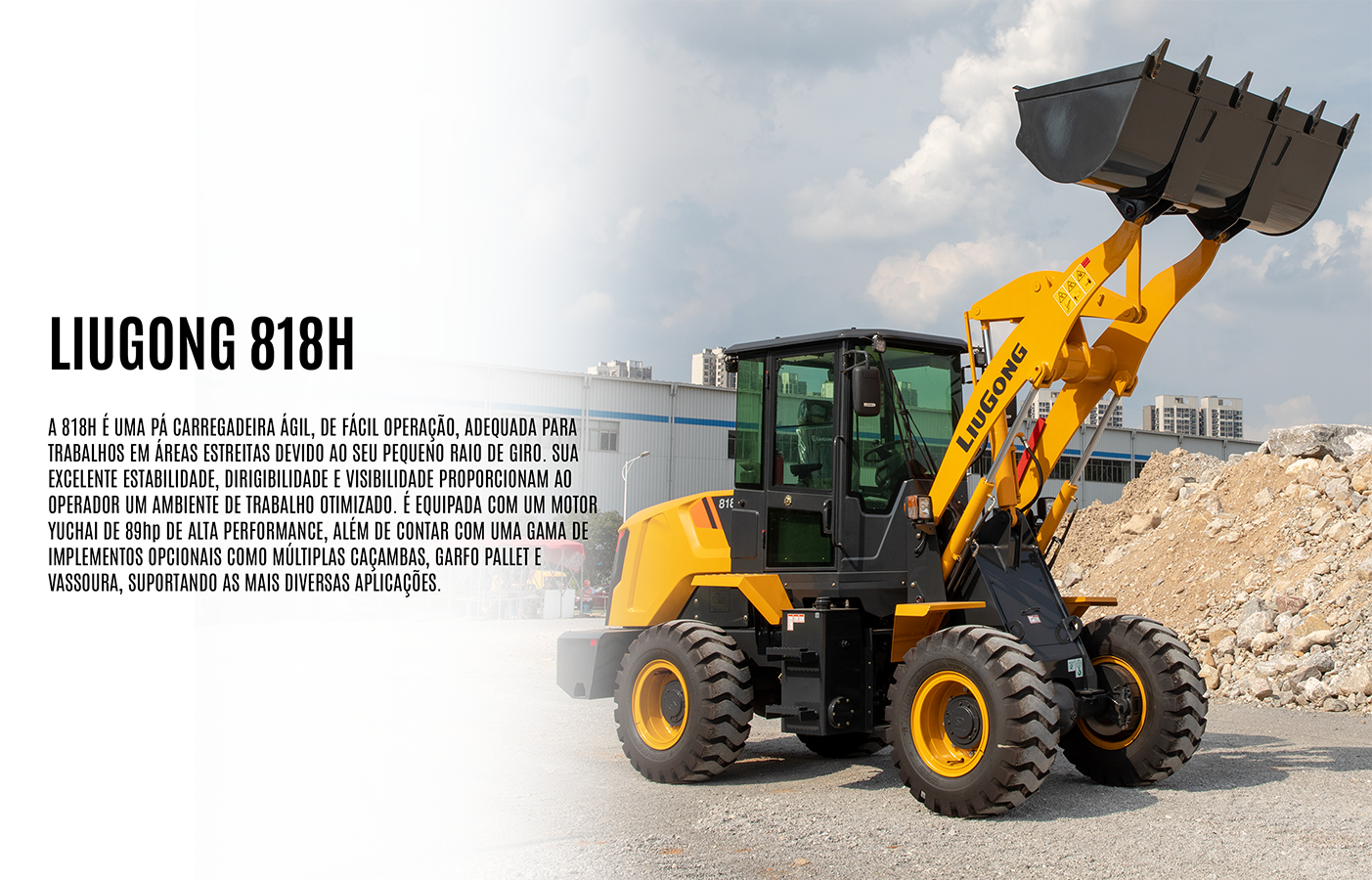 A 818H destaca-se como uma pá carregadeira ágil e de fácil operação, especialmente projetada para trabalhos em áreas estreitas devido ao seu reduzido raio de giro.